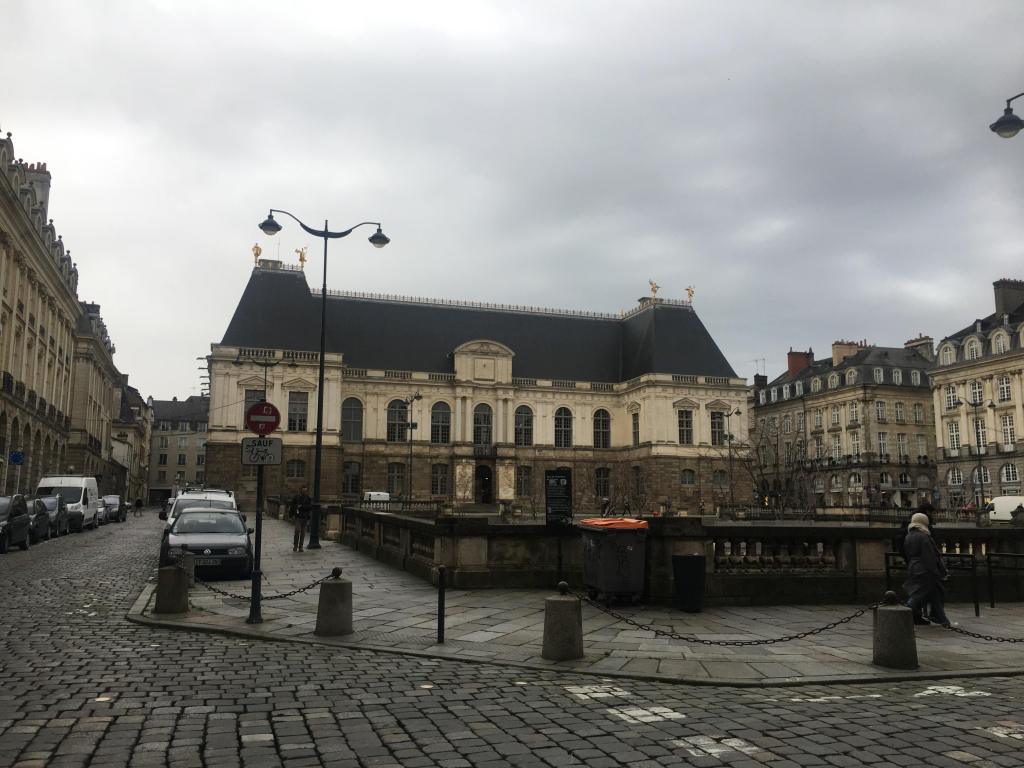 This was taken when I was standing next to a crêperie. You can see the Opéra de Rennes poking out from the left. The opera faces the town hall which is not pictured, but would be found on the right (pictured below). You can see the Palais du Commerce from la Place de la République straight ahead in the center of the picture.